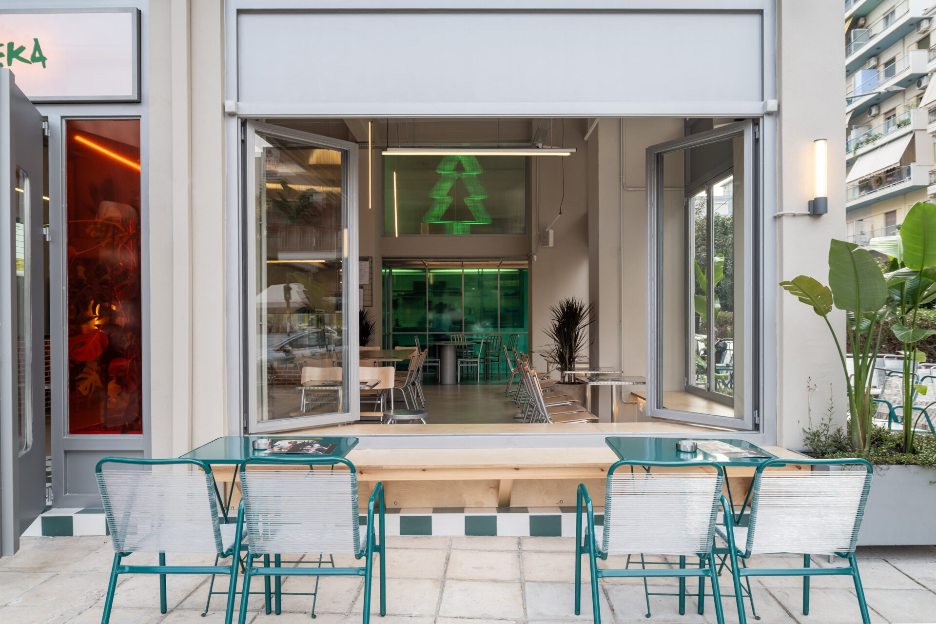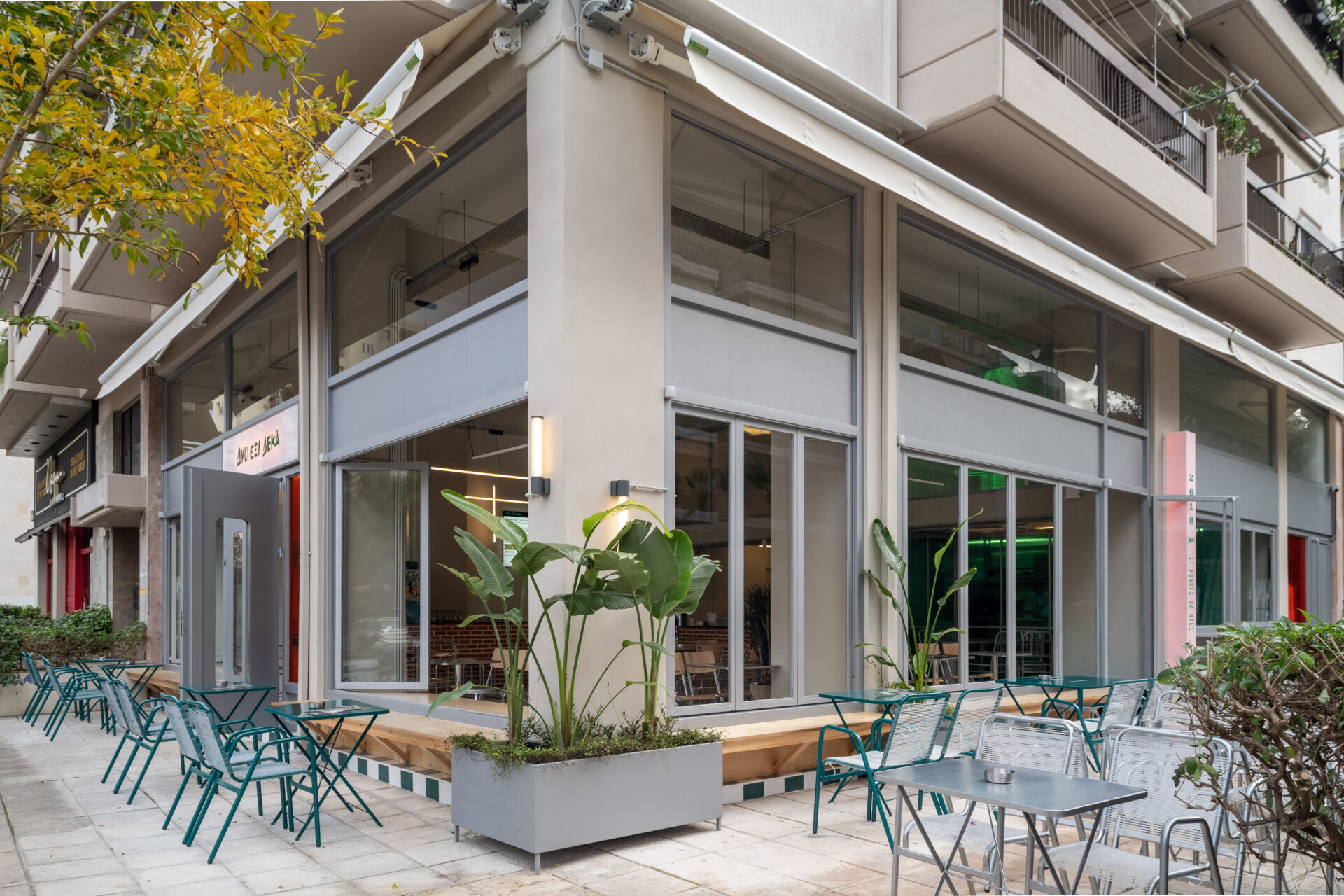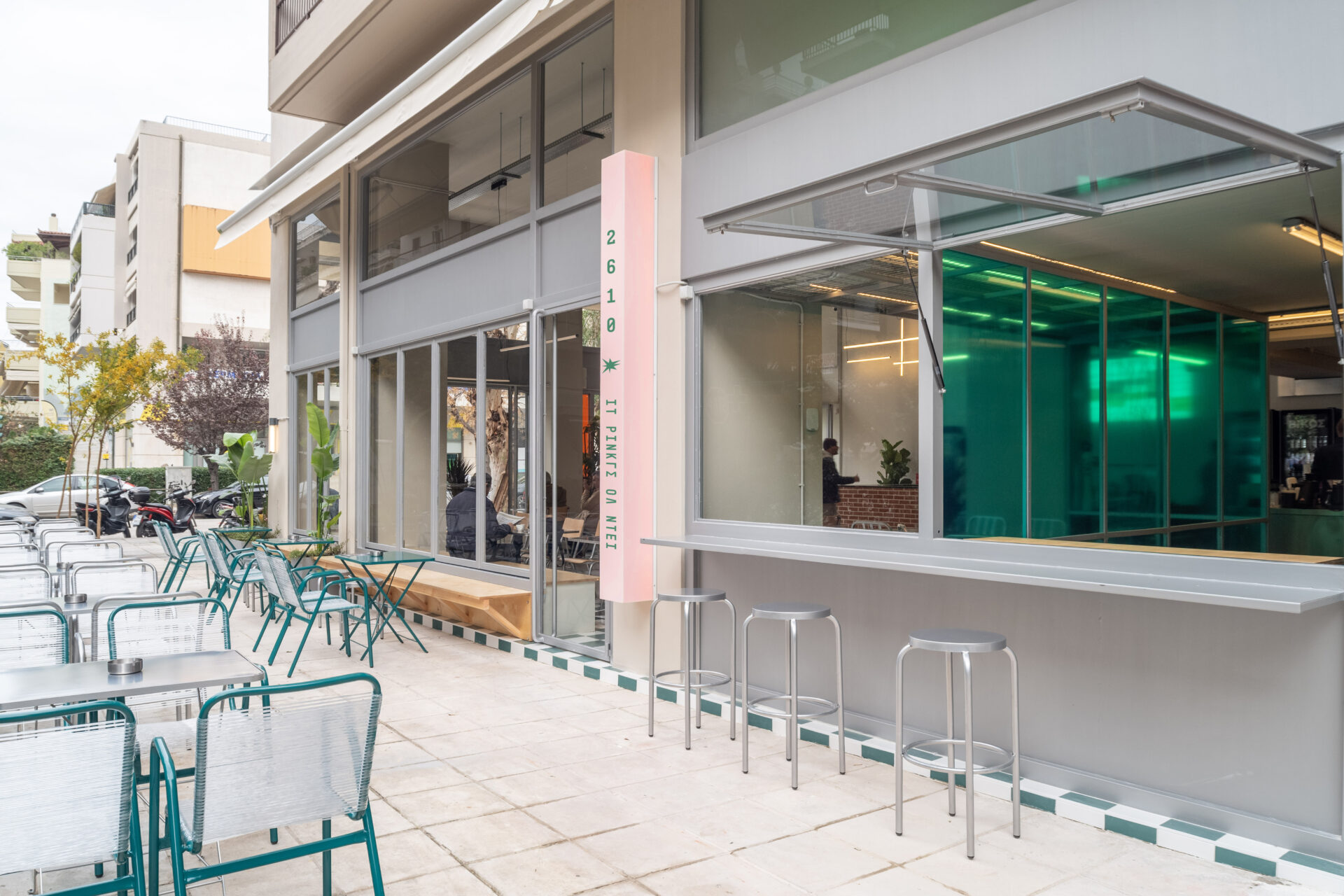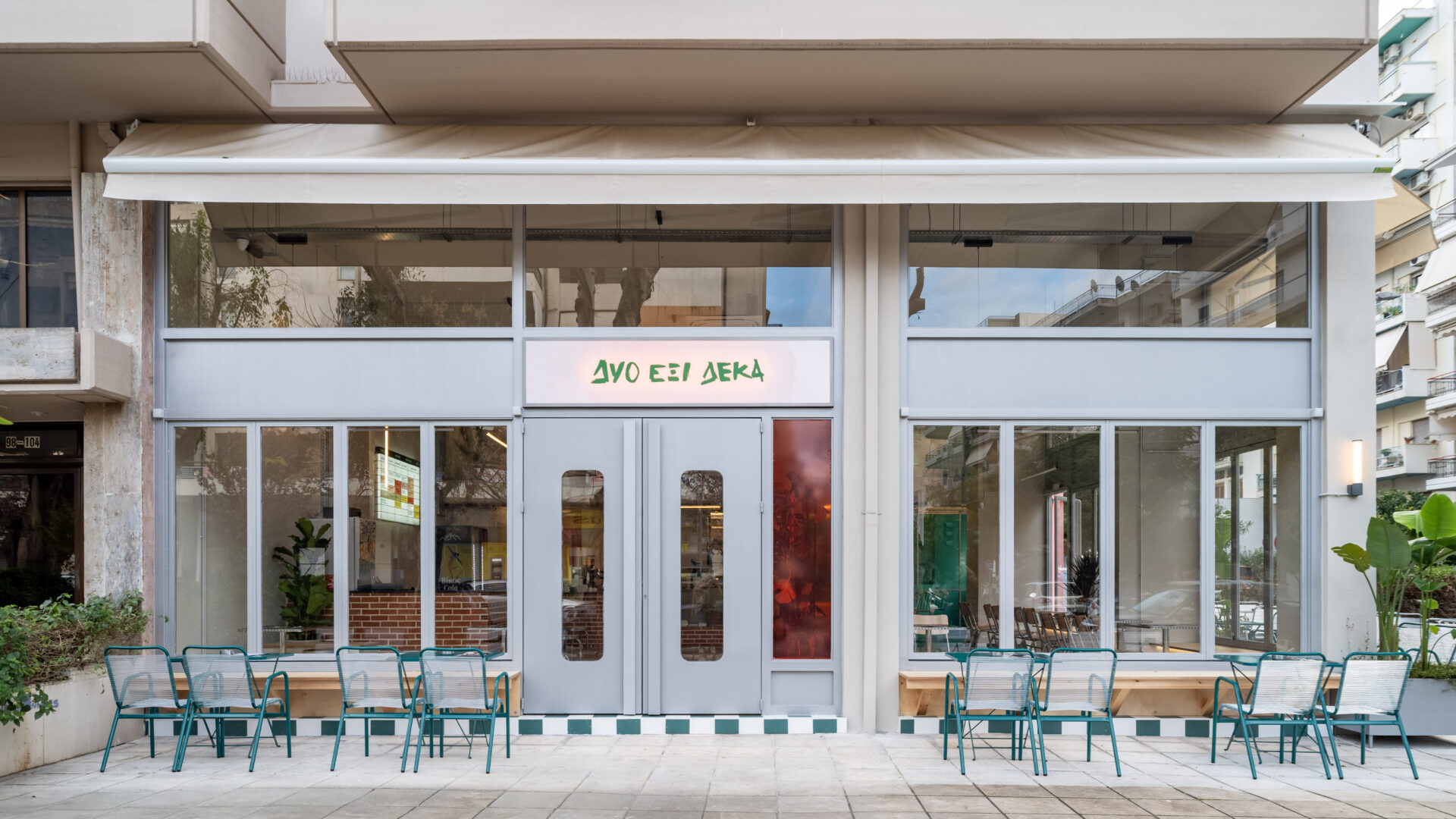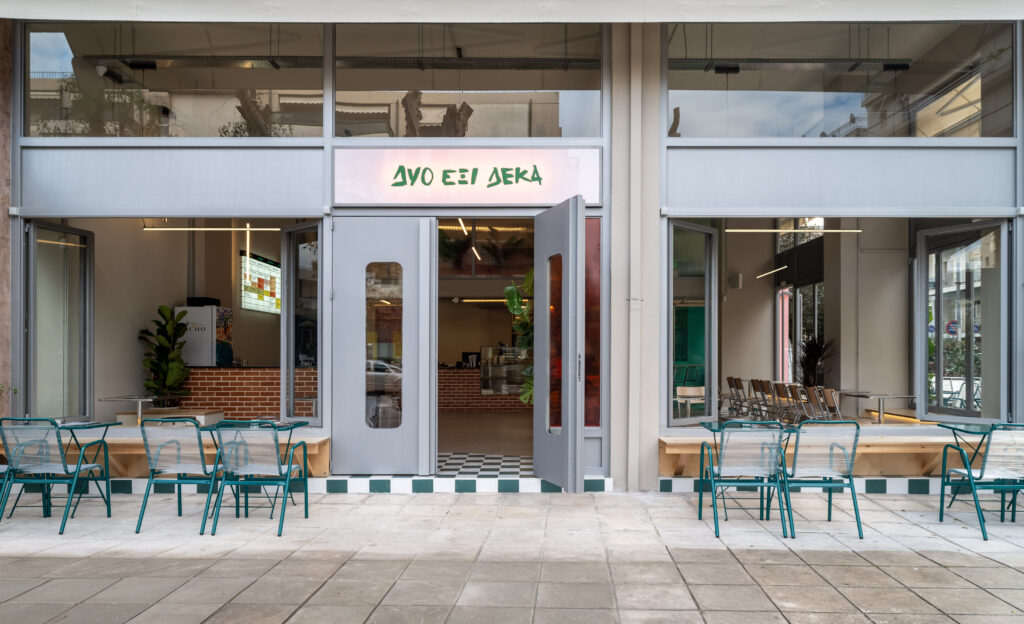 Located in Patras, Greece, DYO EXI DEKA is a project of 173m2, that einterprets the typology of the neighborhood store as an open, permeable space that mediates between the street and the interior. The design emphasizes transparency and continuity, dissolving the boundary between inside and outside through large openings, pivoting doors, and low thresholds that extend the activity of the shop onto the sidewalk.