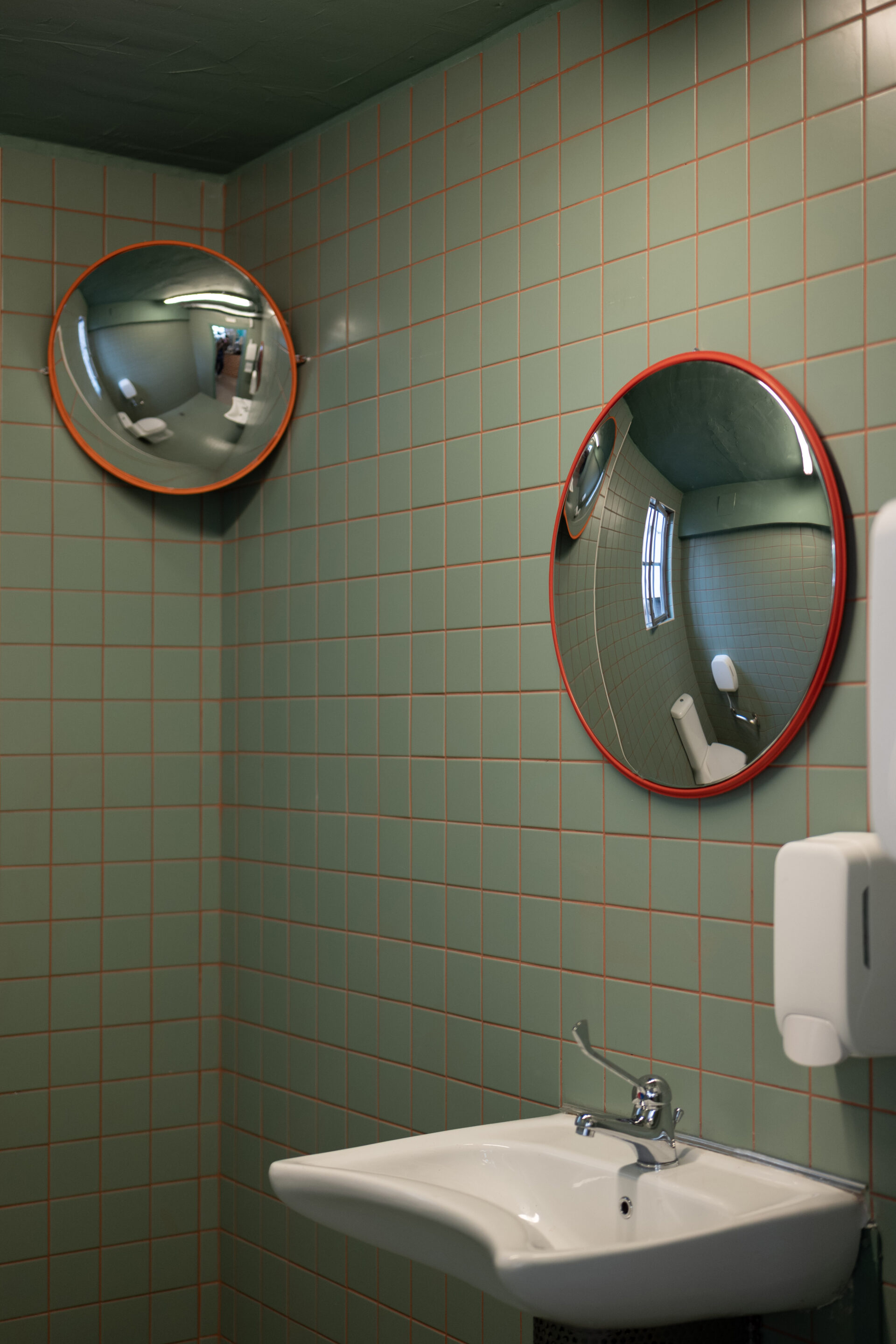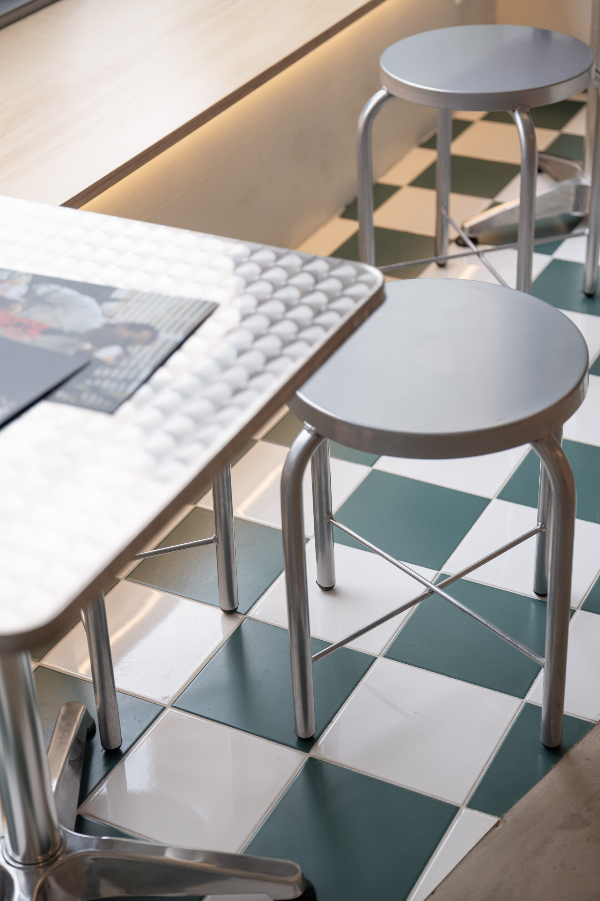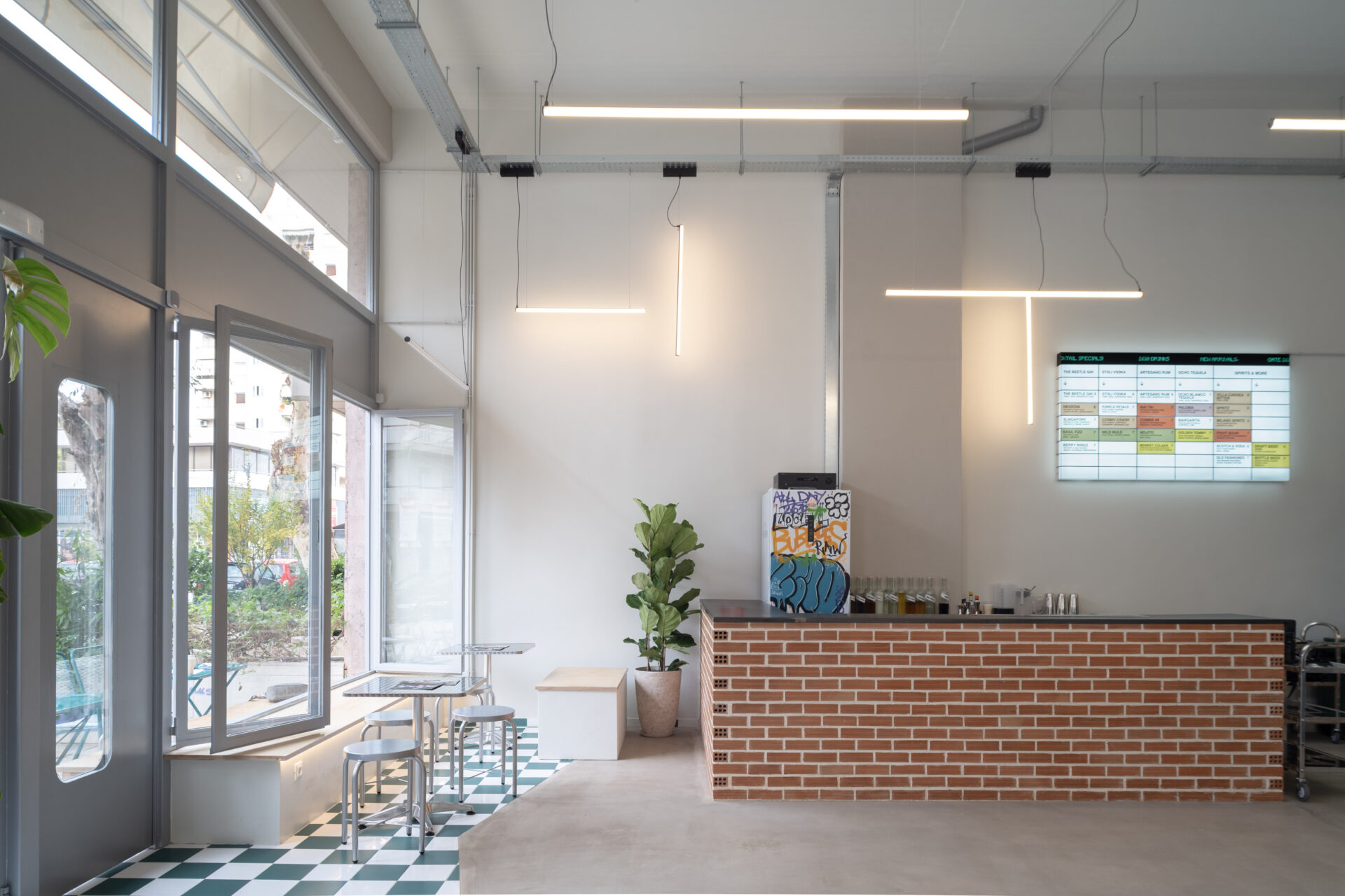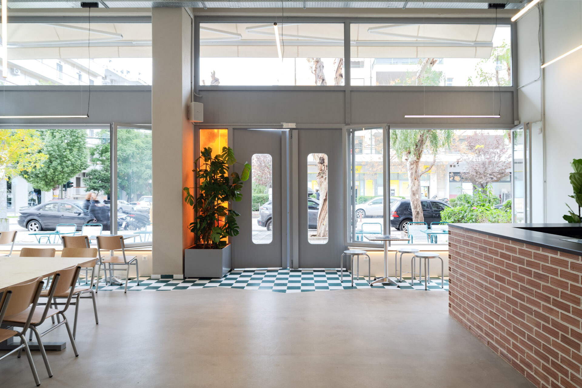 Material choices are restrained and robust. Exposed brick at the counter provides texture and warmth, contrasting with the smooth, continuous flooring and the neutral-toned envelope. A green-and-white tiled zone marks areas of pause and interaction near the façade, subtly guiding movement and defining use without interrupting spatial continuity. Metal frames, visible installations, and off-the-shelf elements are deliberately left exposed, reinforcing an honest, utilitarian aesthetic.