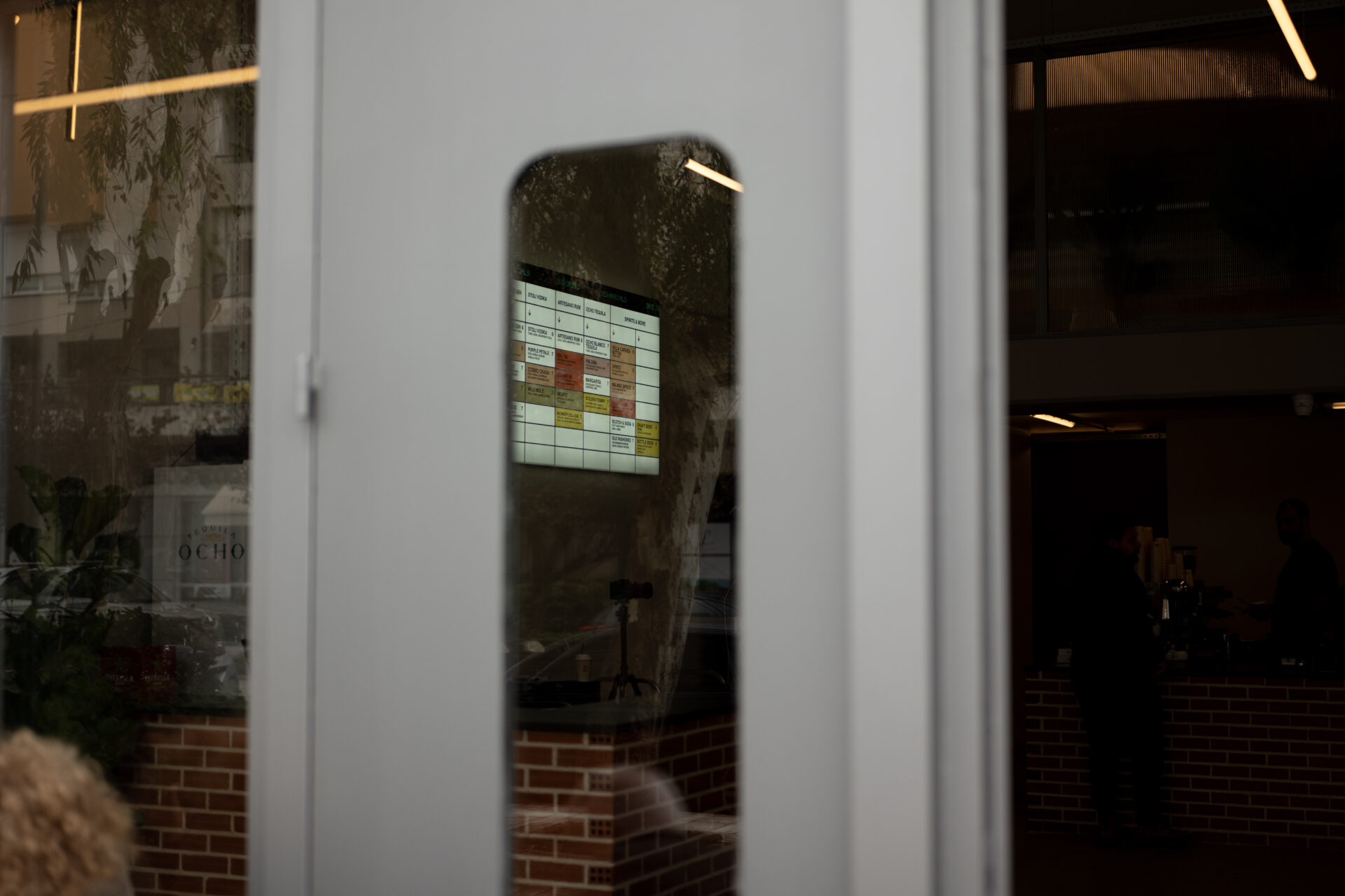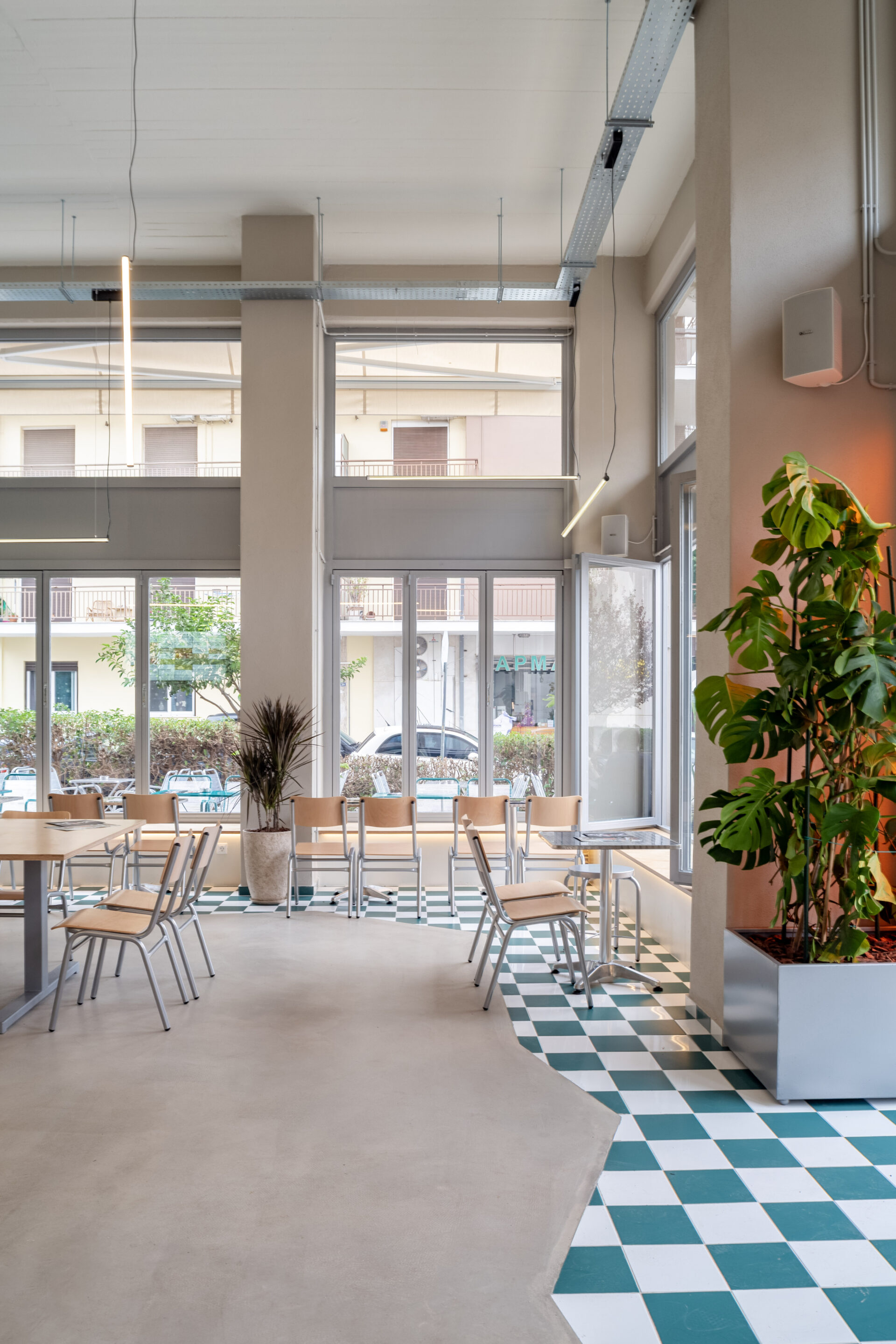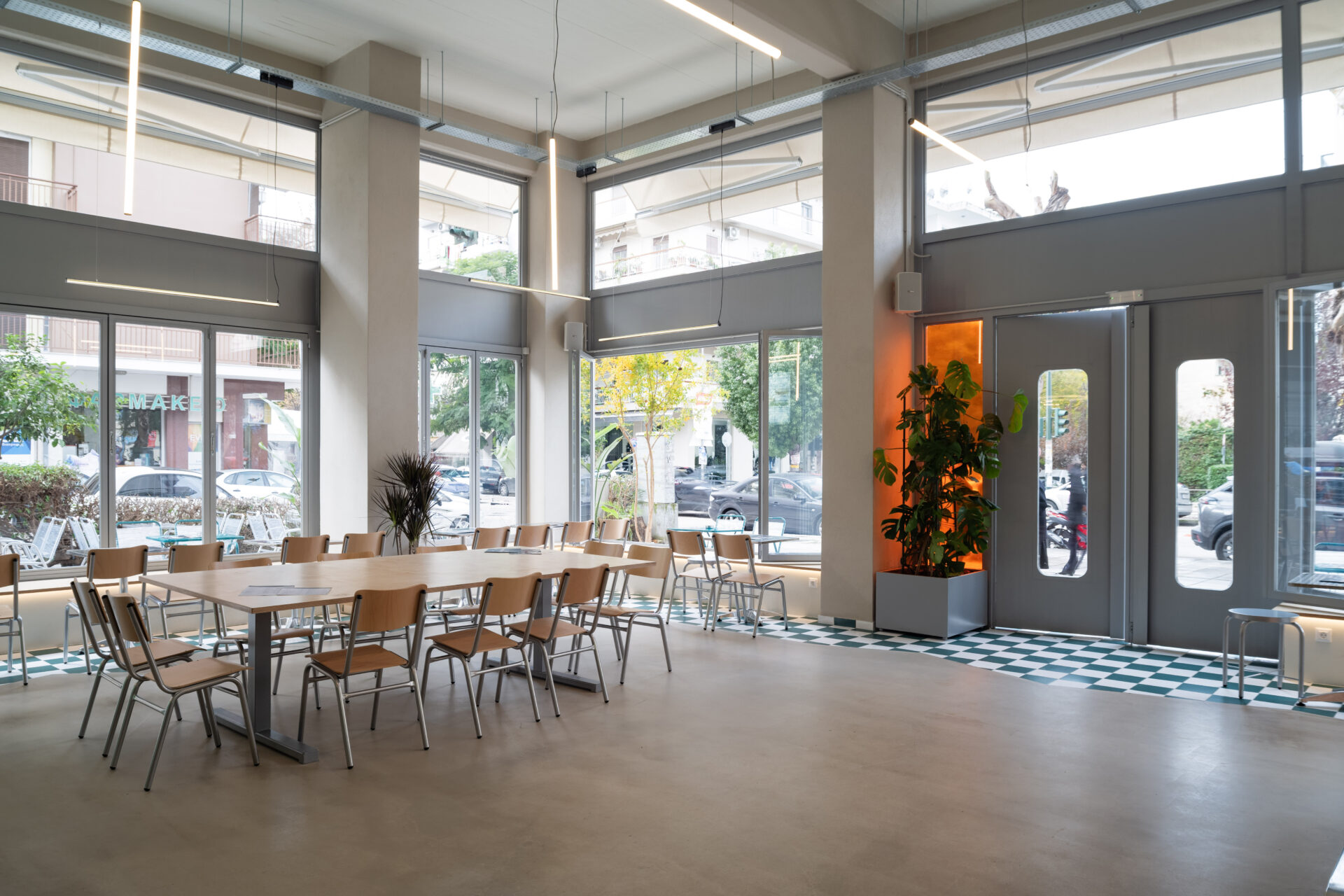 The interior is organized as a single, flexible space articulated by structural columns rather than partitions. A clear visual axis connects the entrance to the service counter, allowing the program to unfold gradually while maintaining openness and legibility. The generous ceiling height enhances the sense of spaciousness and supports a lighting system composed of suspended linear fixtures, which introduce rhythm and scale while reinforcing the industrial character of the space.